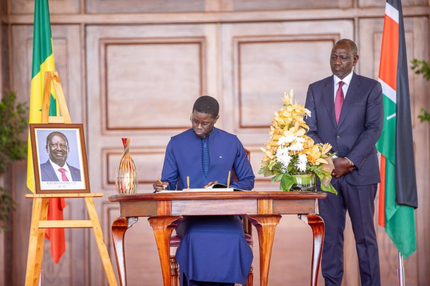 Senegal’s President Bassirou Diomaye Faye signs a condolence book eulogising Raila Odinga as Kenya's President William Ruto looks on at State House, Nairobi on October 21, 2025. /PCS