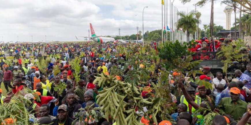 The procession, which was supposed to reach Parliament by noon, was delayed after thousands of Kenyans flooded the airport to witness the arrival.